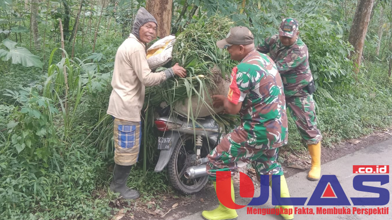 Dalam momen penuh kebersamaan itu, anggota Satgas TMMD bersama Babinsa langsung turun tangan saat melihat seorang warga kesulitan mengangkat rumput yang akan dibawa pulang sebagai pakan ternak.